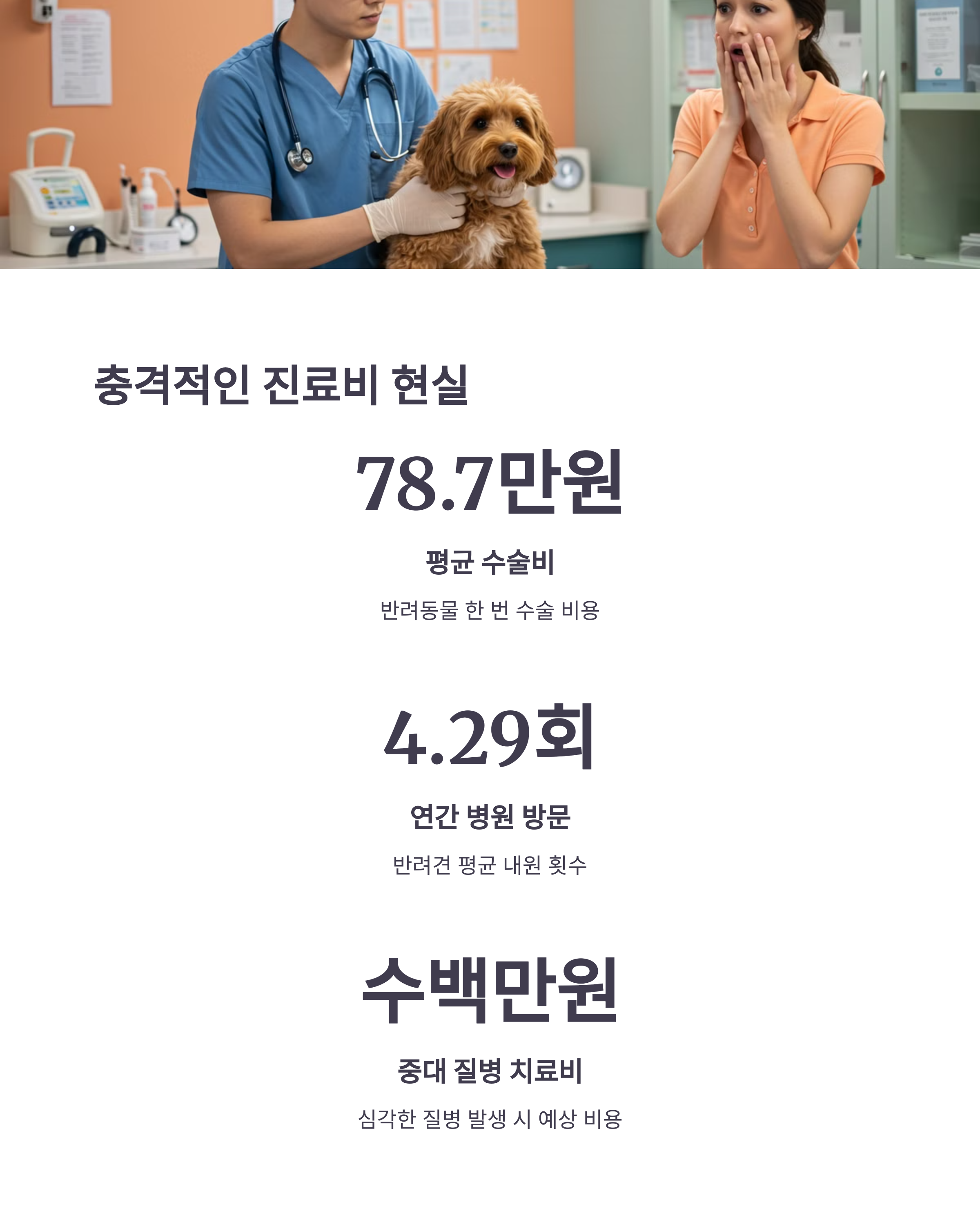 최근 통계에 따르면 반려견 한 마리당 연간 의료비는 평균 50만원 이상이며, 중대 질병 발생 시 수백만 원의 치료비가 발생할 수도 있습니다.
