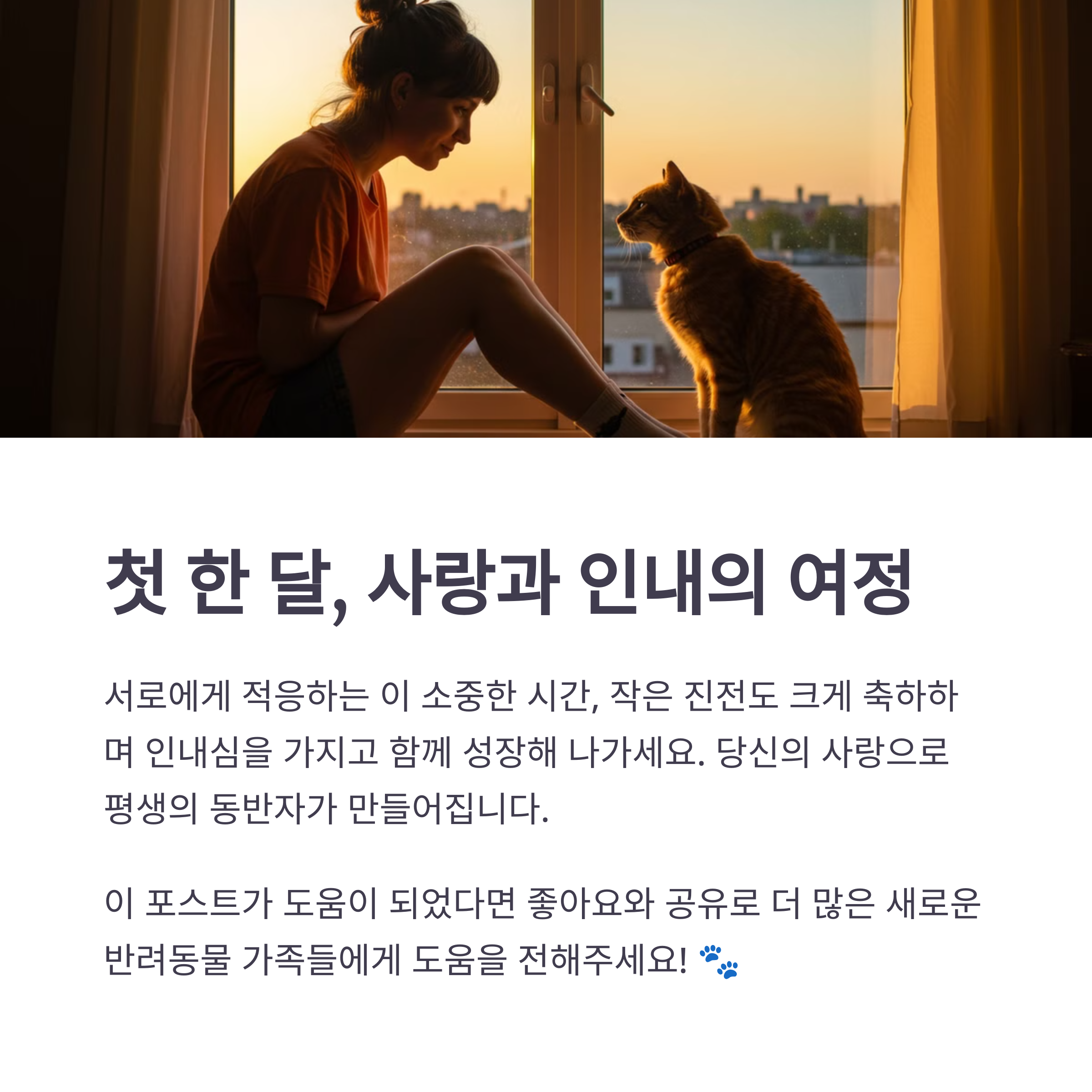 반려동물과의 첫 한 달은 인내와 사랑이 정말 중요한 시기예요. 모든 것이 완벽할 필요는 없어요. 서로 알아가는 과정이니까요. 🥰