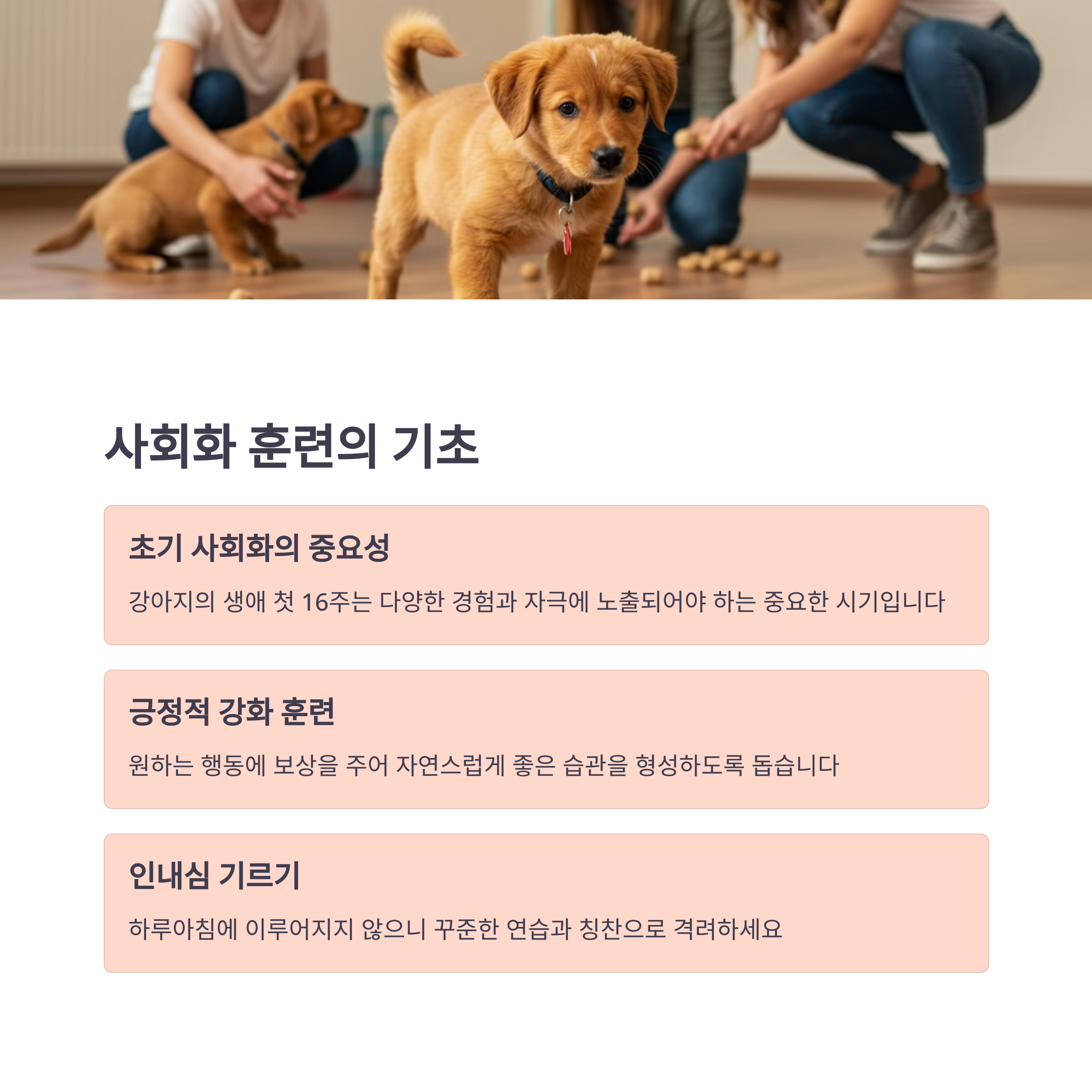 특히 강아지의 경우 초기 사회화 훈련이 정말 중요해요. 다양한 환경, 소리, 사람들을 경험하게 해주세요. 🐕
