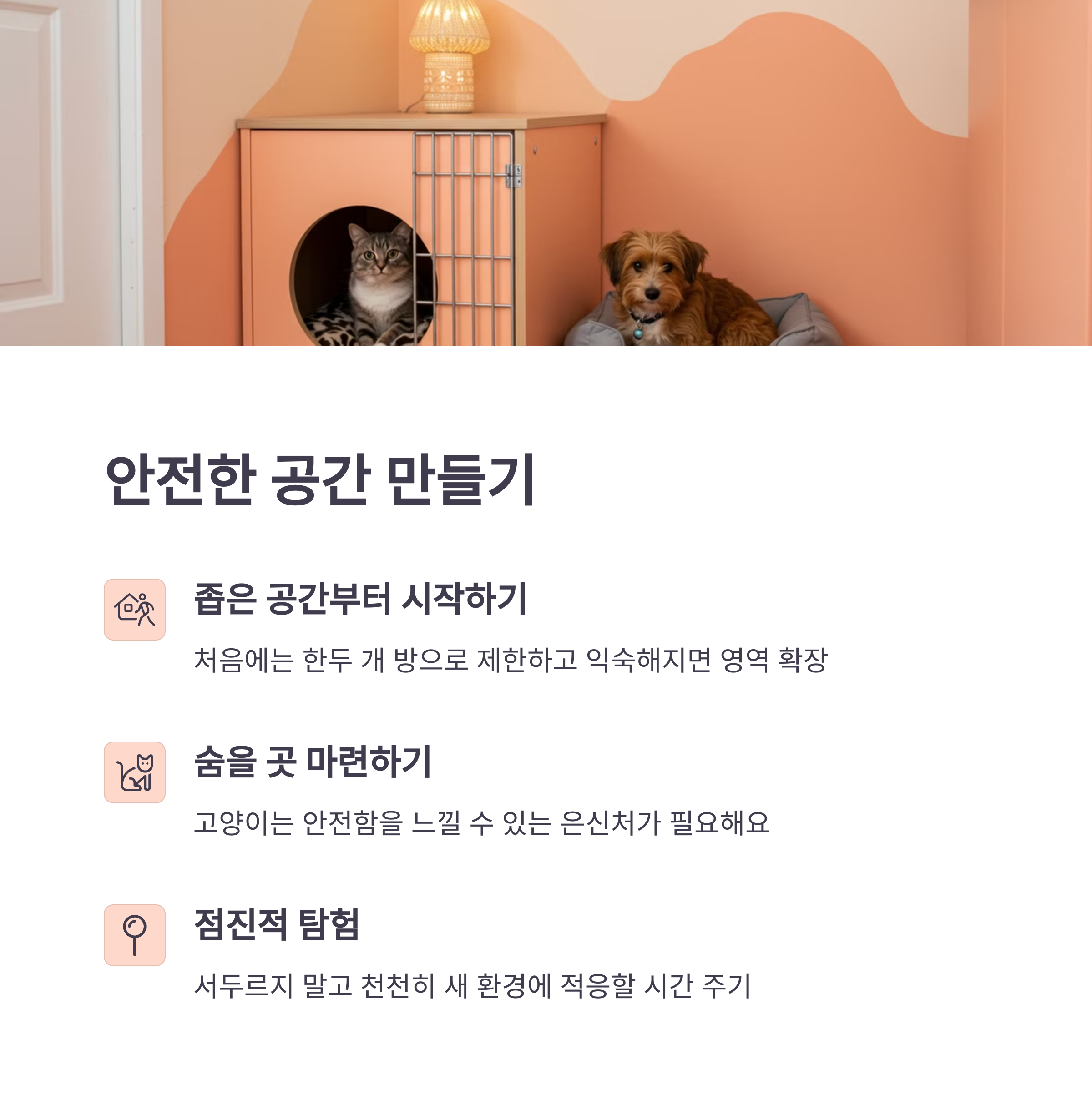 반려동물이 새로운 환경에 적응하는 데는 시간이 필요해요. 천천히 공간을 확장해 나가는 것이 좋답니다.