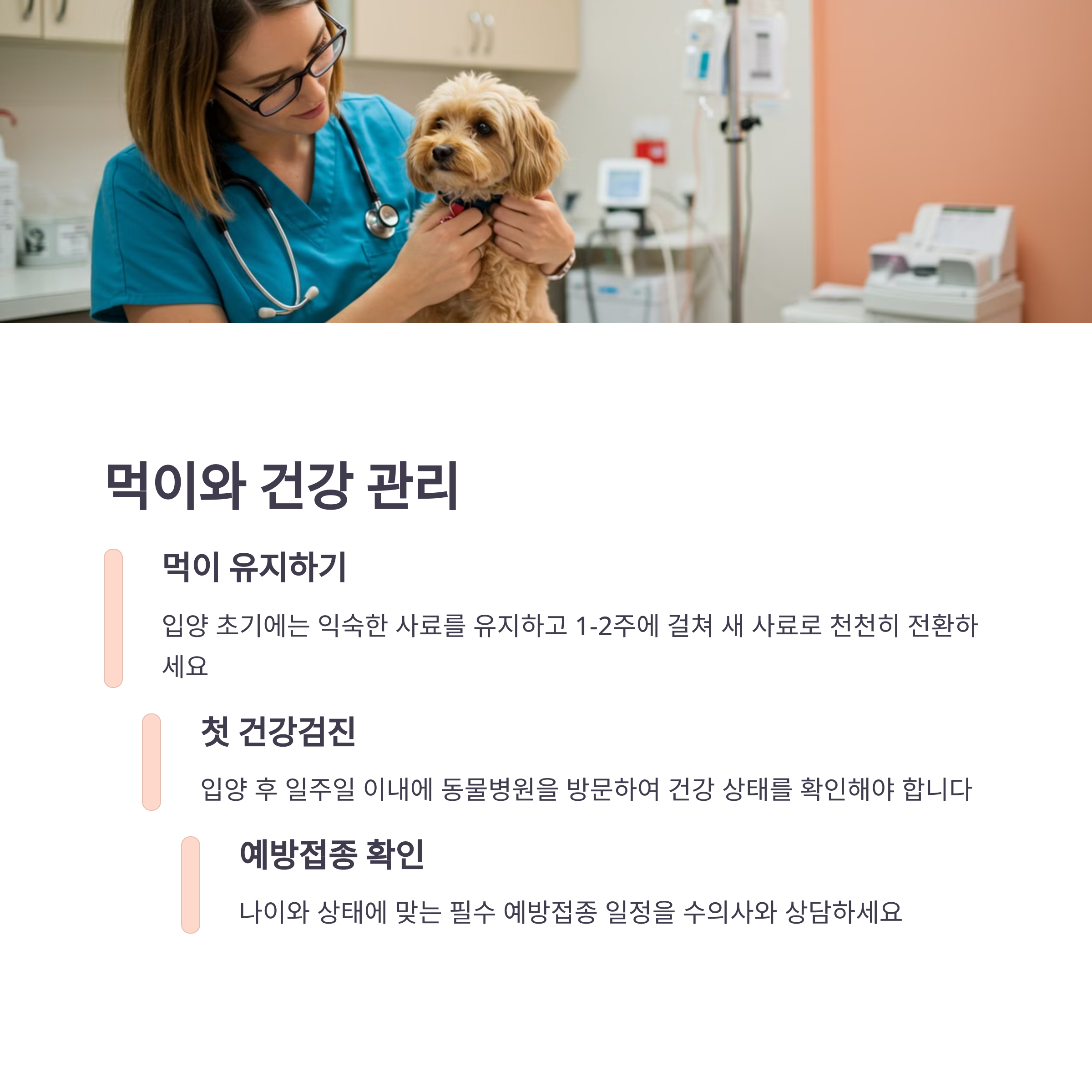 입양 후 1주일 이내에 동물병원 방문은 필수예요! 기본적인 건강 체크와 예방접종 일정을 확인해야 합니다. 🩺