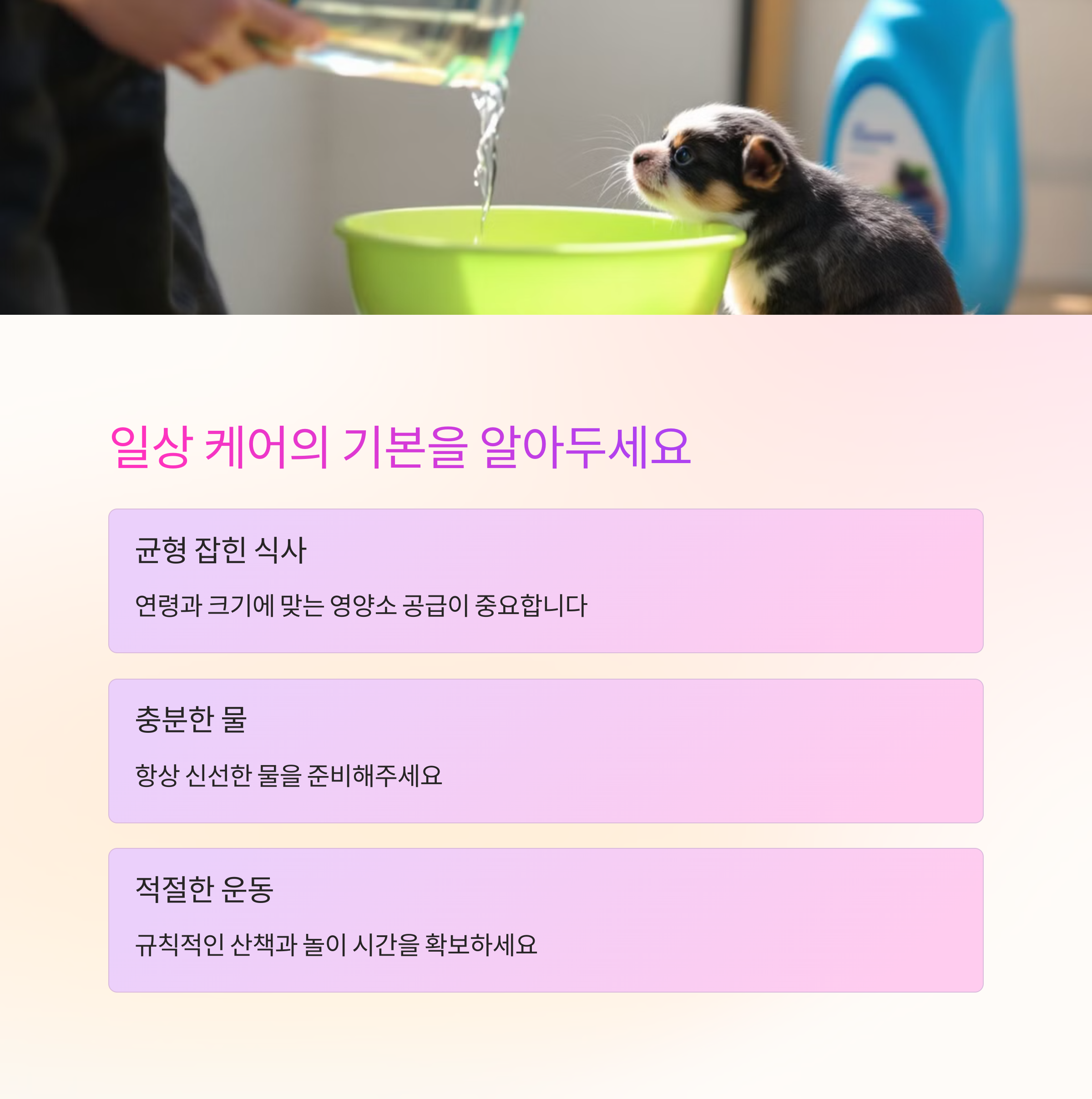 💧 깨끗한 물은 항상 준비되어 있어야 해요. 물그릇은 자주 세척하고, 신선한 물을 공급해주세요.