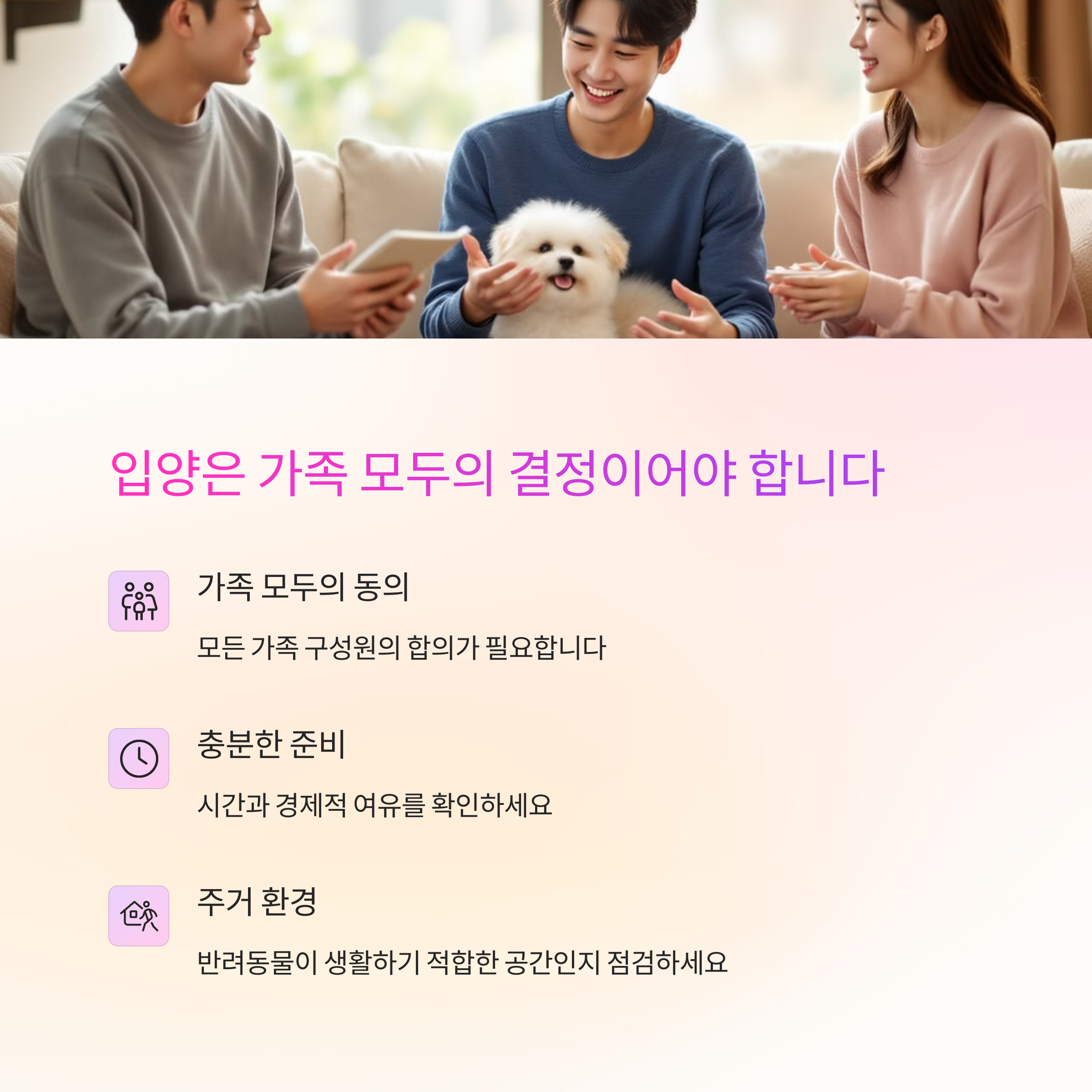 또한 가족 모두의 동의를 얻는 것도 중요해요. 혼자만의 결정이 아닌 함께 책임질 수 있는 환경을 만들어주세요.