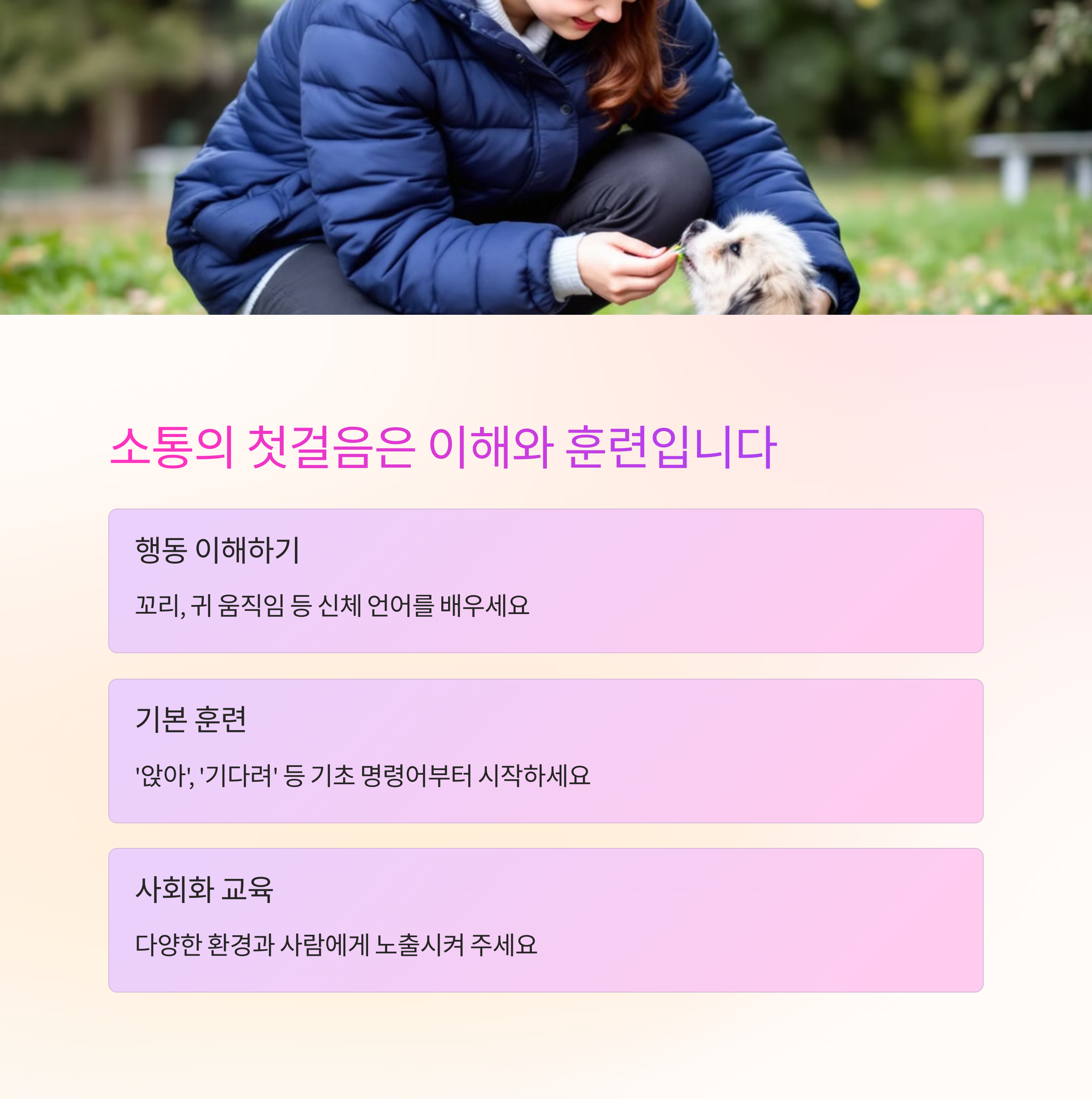 처음엔 낯설고 어려울 수 있지만, 서로에 대한 이해와 인내심을 가지고 꾸준히 노력한다면 특별한 유대감을 형성할 수 있어요.