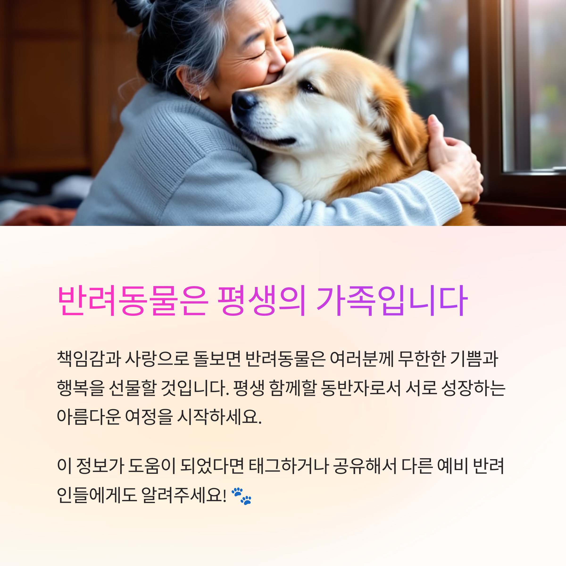 반려동물과의 생활은 책임이기도 하지만, 그 이상으로 큰 기쁨과 행복을 선물해줄 거예요.