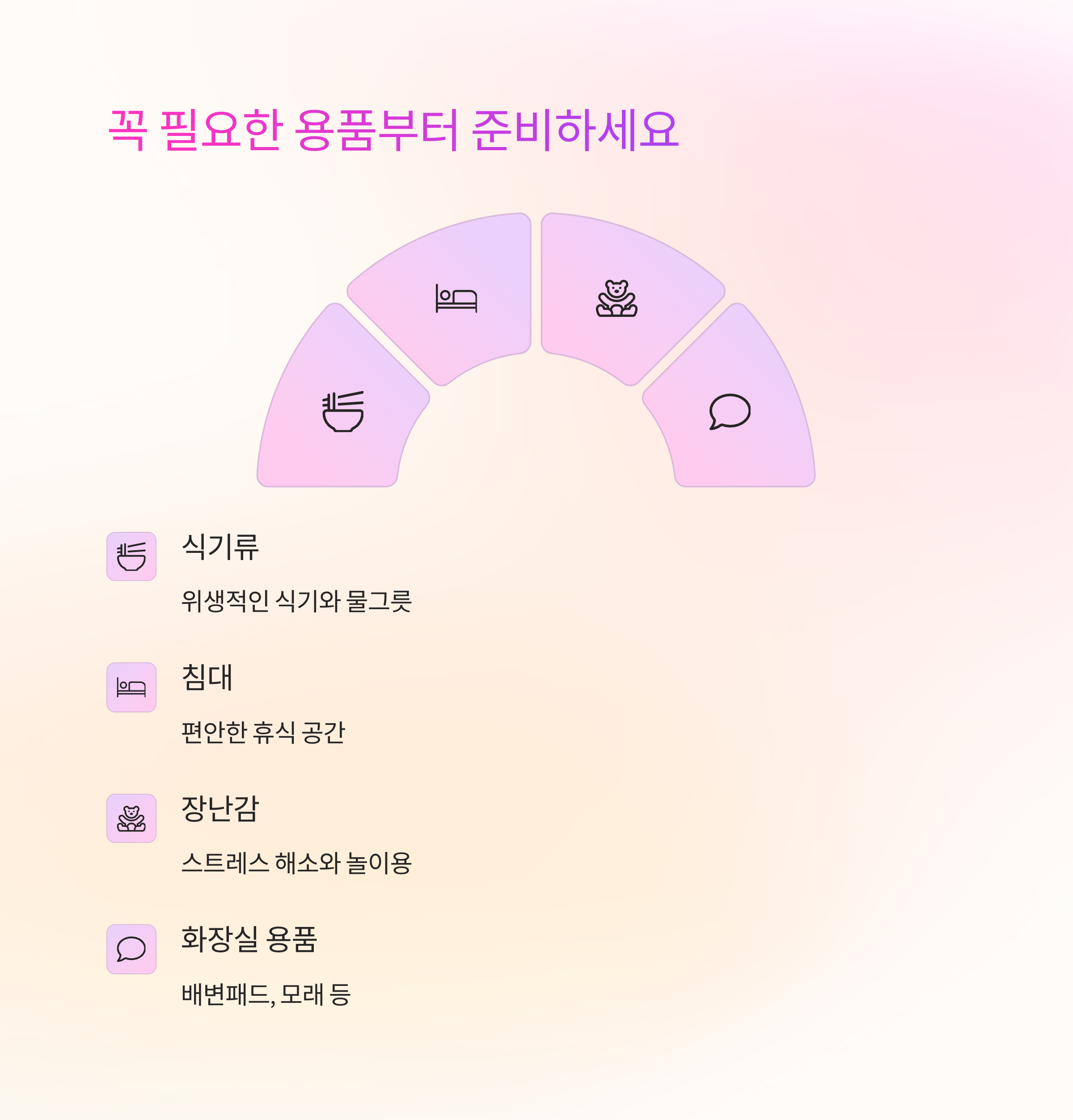 🚽 화장실 용품은 종류에 맞게 준비해야 해요. 고양이는 화장실 모래와 화장실 상자, 강아지는 배변패드나 산책용 배변봉투가 필요해요.
