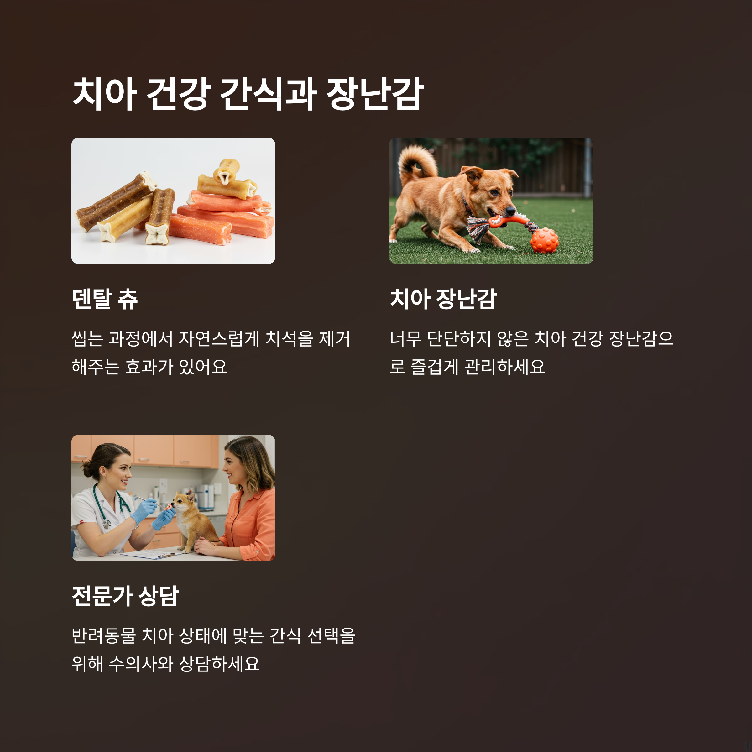 치석 제거에 도움이 되는 간식이나 치아 건강에 좋은 장난감을 활용하는 것도 좋은 방법이에요.