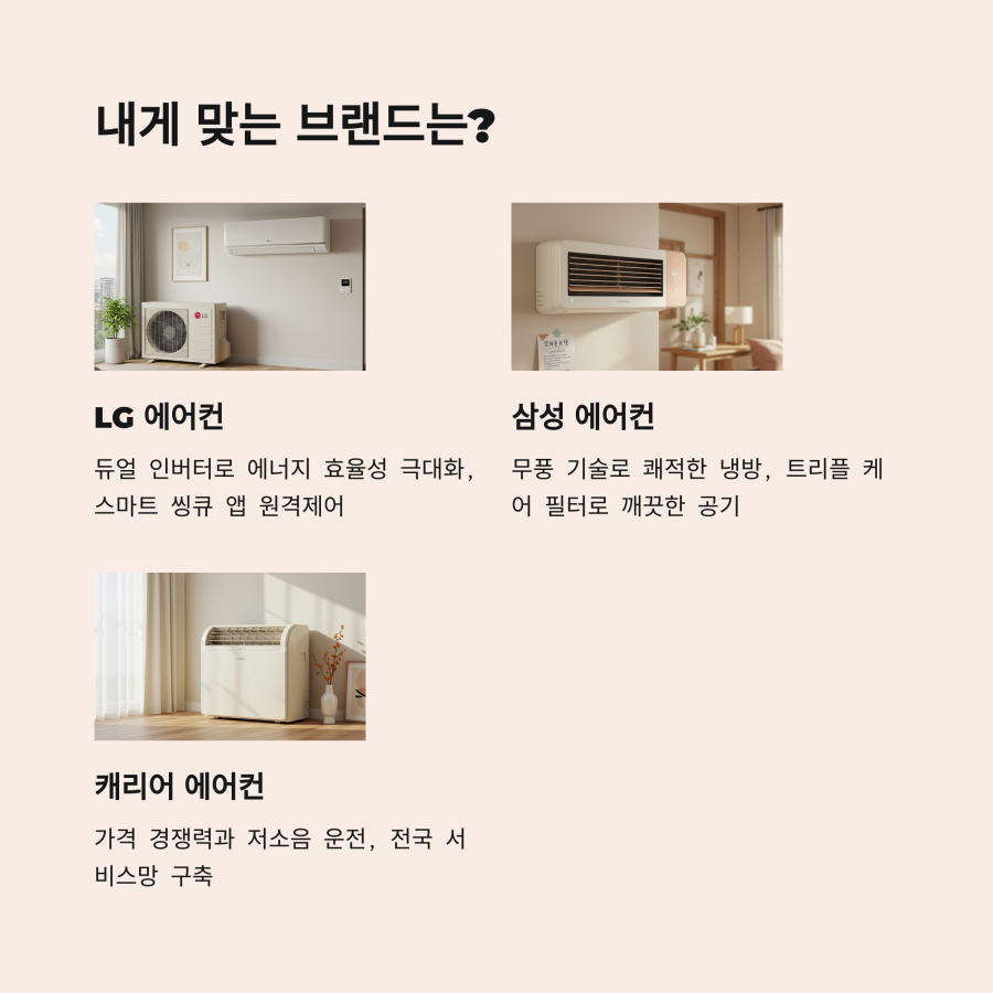 세 브랜드를 비교해볼 때, LG와 삼성은 스마트 기능과 첨단 기술에서 앞서나가는 반면, 캐리어는 가격 대비 성능 면에서 강점을 보입니다.