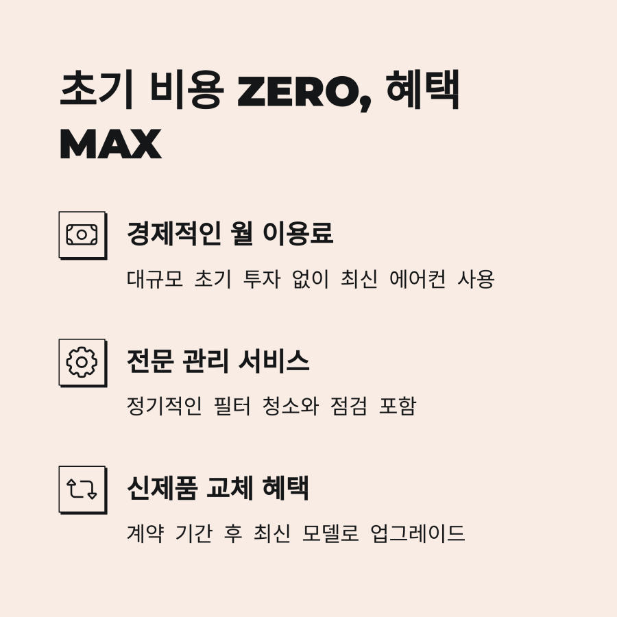 왜 많은 분들이 구매 대신 렌탈을 선택하고 있을까요? 초기 비용 부담 없이 월 이용료만으로 최신 에어컨을 사용할 수 있고, 정기적인 관리 서비스까지 받을 수 있다는 장점이 있기 때문이죠.