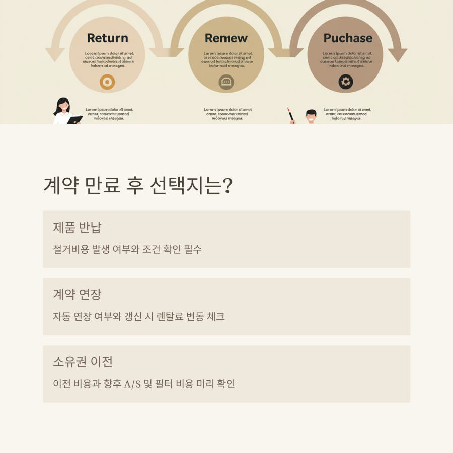 또한 계약 연장 시 렌탈료가 얼마나 할인되는지, 제품 반납 시 철거 비용은 누가 부담하는지 등의 조건도 미리 파악해두면 좋습니다.