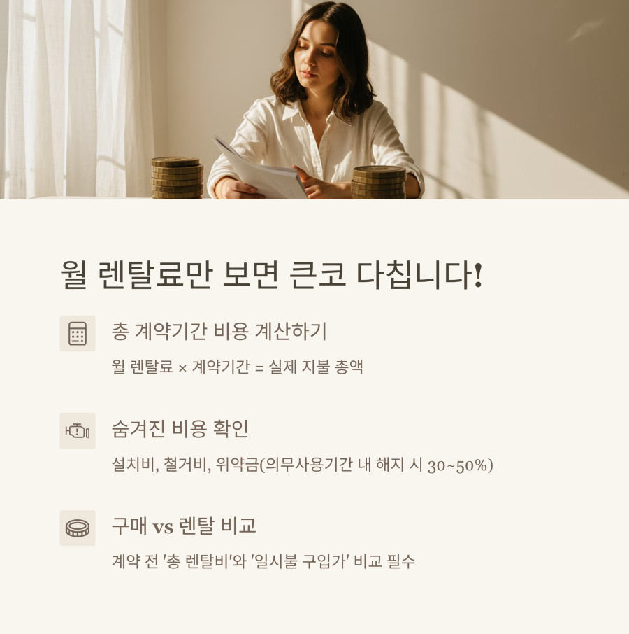 하지만 월 렌탈료만 보고 판단하면 큰 코 다칠 수 있습니다! 총 계약기간 동안 지불하는 총액을 반드시 계산해보세요.