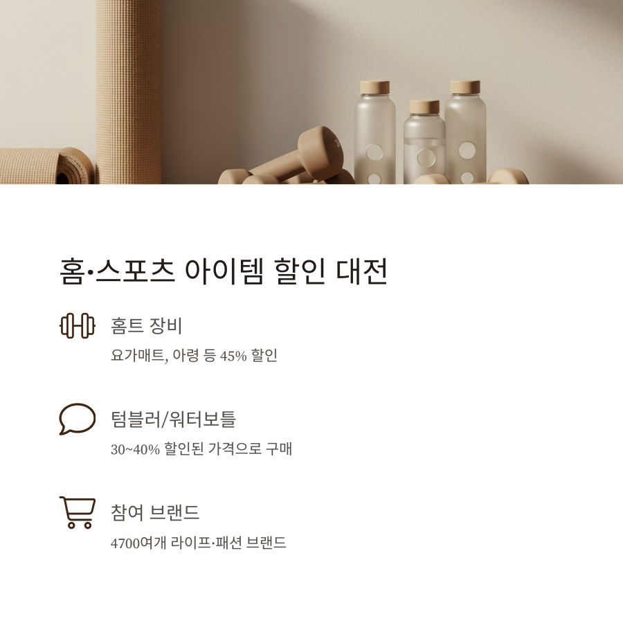 요가 매트, 아령, 폼롤러 등 기본 홈트 장비가 최대 45% 할인 중이에요.