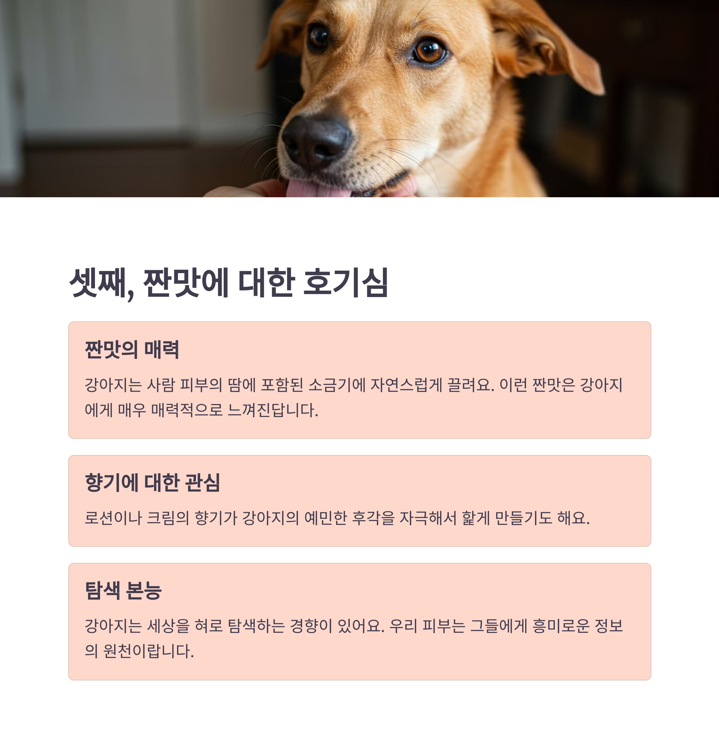 사람의 피부에는 소금기가 있는 땀이 있어 강아지에게 맛있게 느껴질 수 있어요.