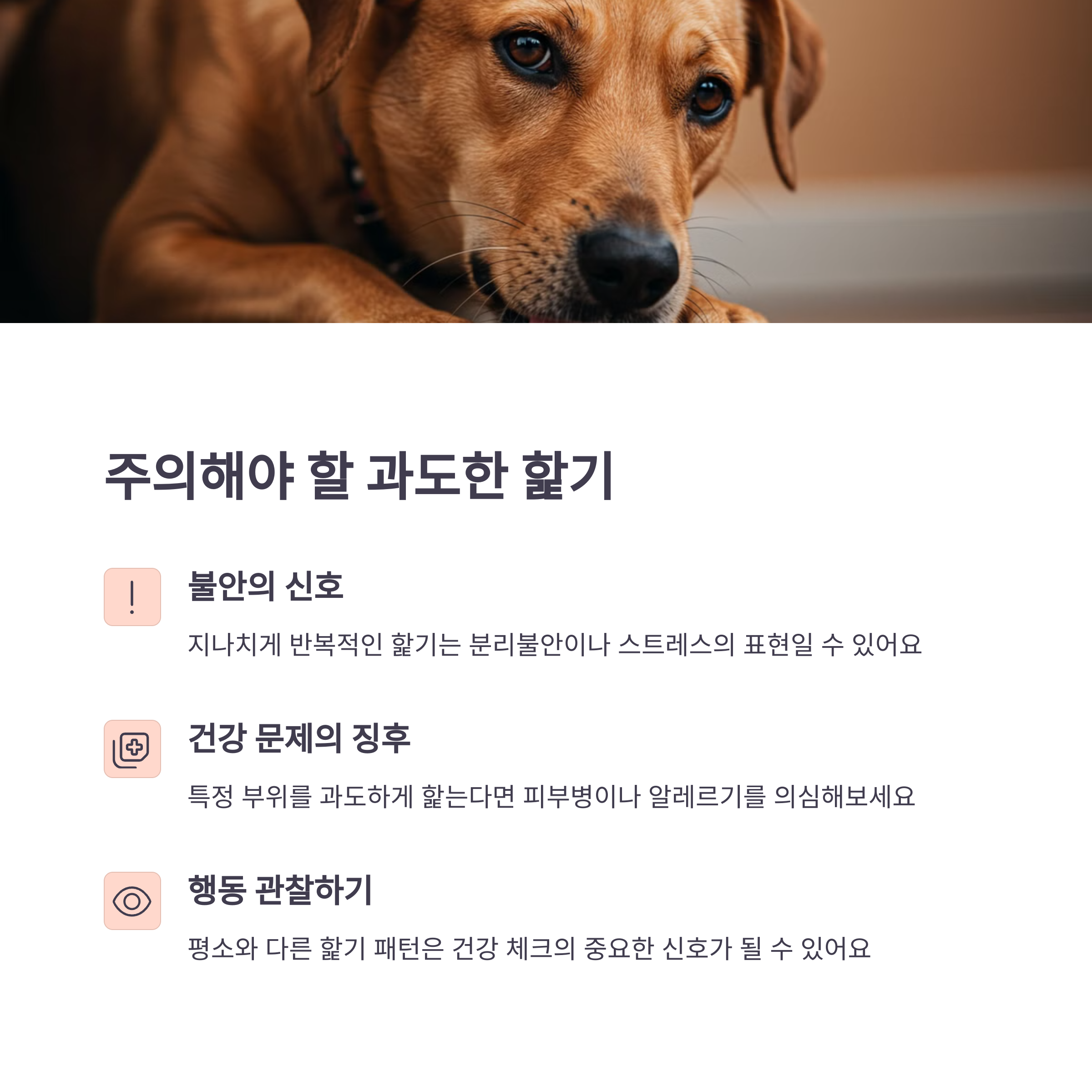 | 강아지가 계속 핥으면 건강에 문제가 있나요? | 과도한 핥기는 불안, 스트레스, 알레르기나 피부 문제의 신호일 수 있어요. 행동 패턴의 갑작스러운 변화는 수의사와 상담하는 것이 좋습니다. |