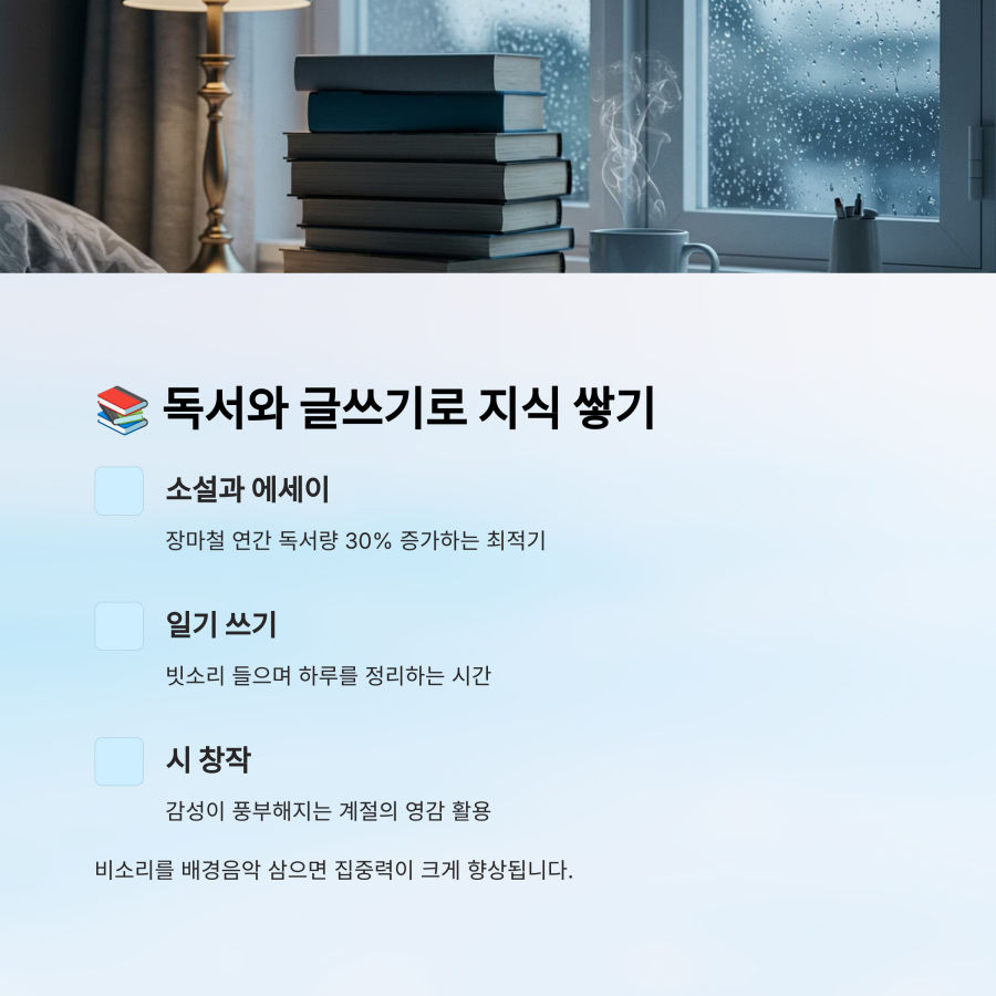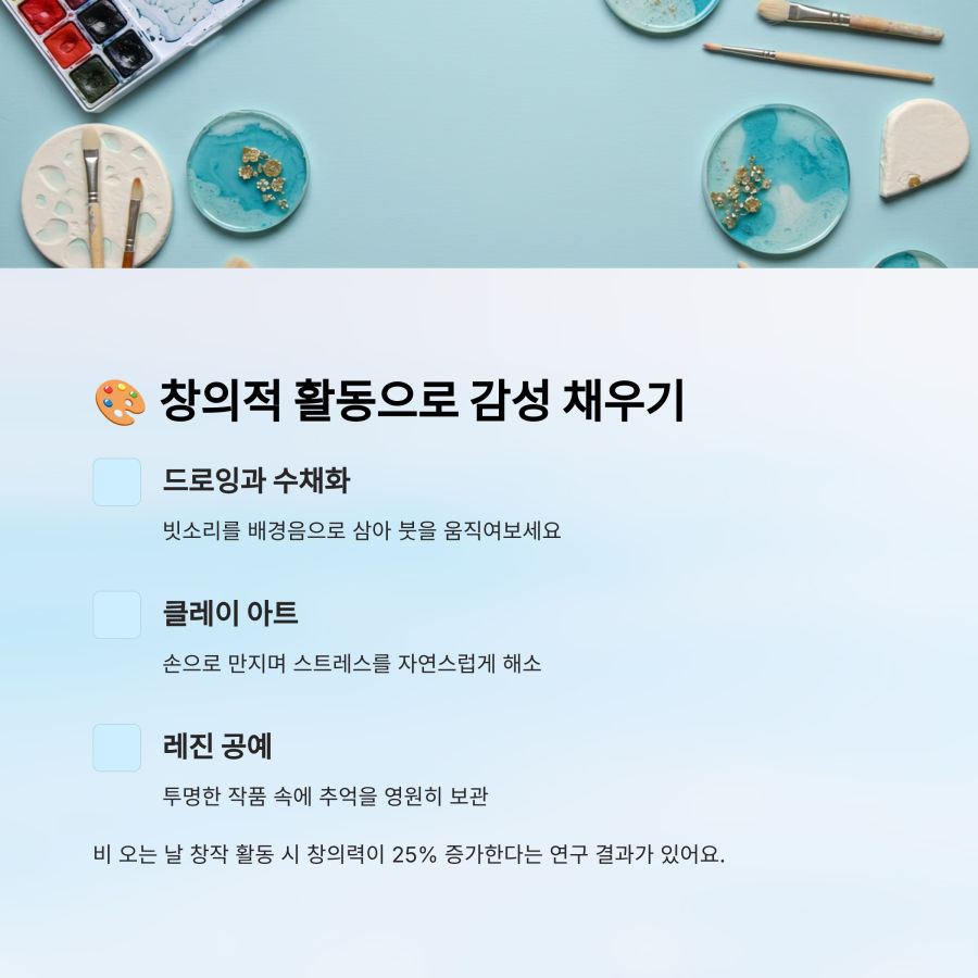 장마철은 오히려 새로운 취미를 발견하고 자기 계발을 할 수 있는 절호의 기회가 될 수 있어요.