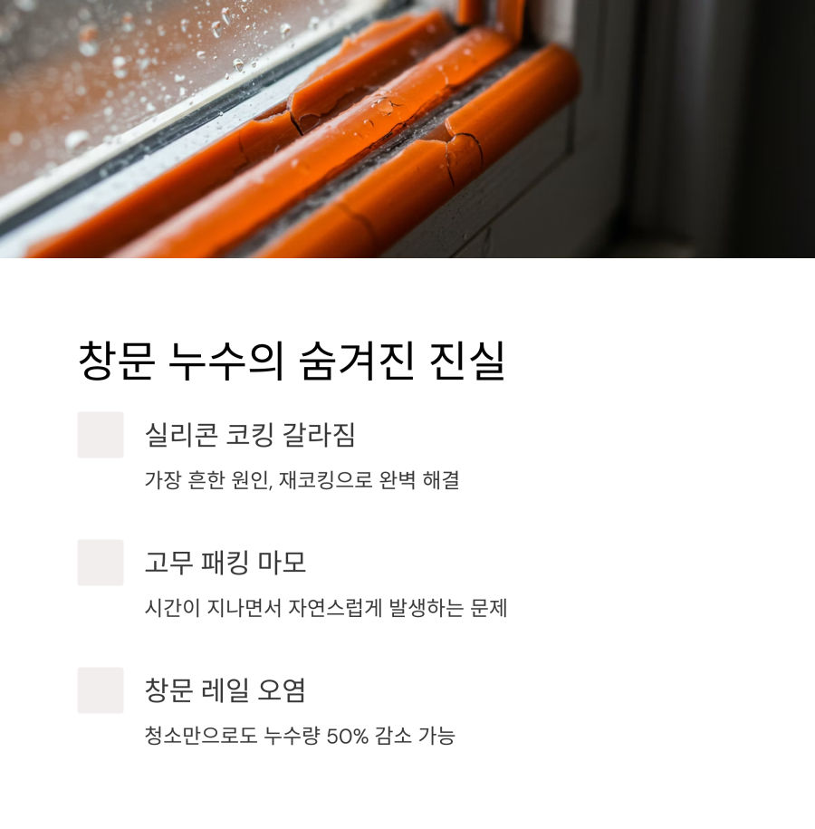 또한 창문 레일에 쌓인 먼지와 이물질을 깨끗이 청소하는 것만으로도 누수를 상당히 줄일 수 있어요! 🧹