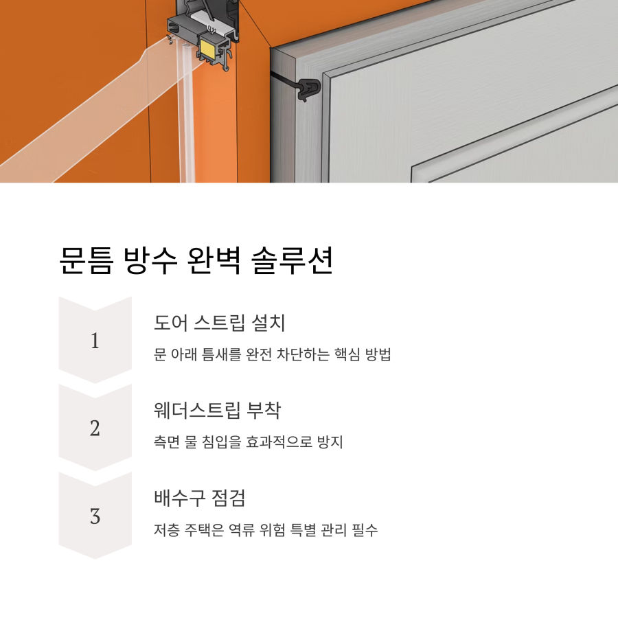 또한 문 주변에 방수 웨더스트립을 부착하면 비가 옆으로 들이치는 경우에도 물 침입을 막아줍니다.