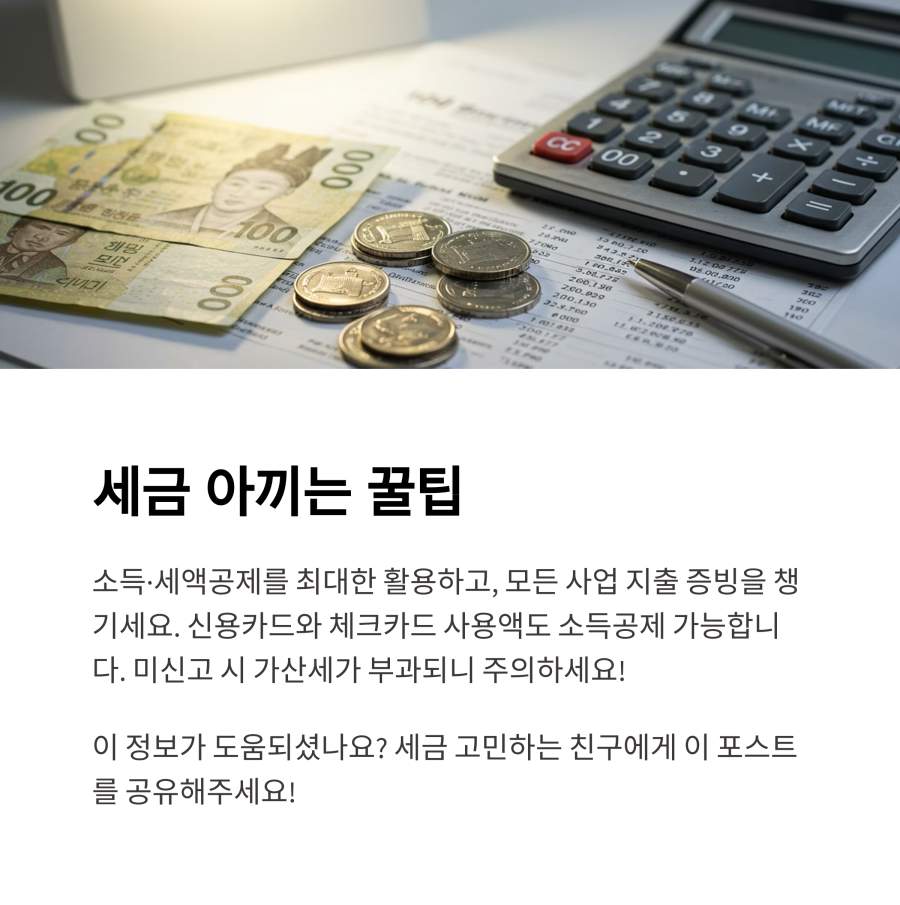 둘째, 사업 관련 지출은 증빙자료를 꼼꼼히 모아두세요. 사업자 카드나 통장을 별도로 사용하면 관리가 더 편리해요.