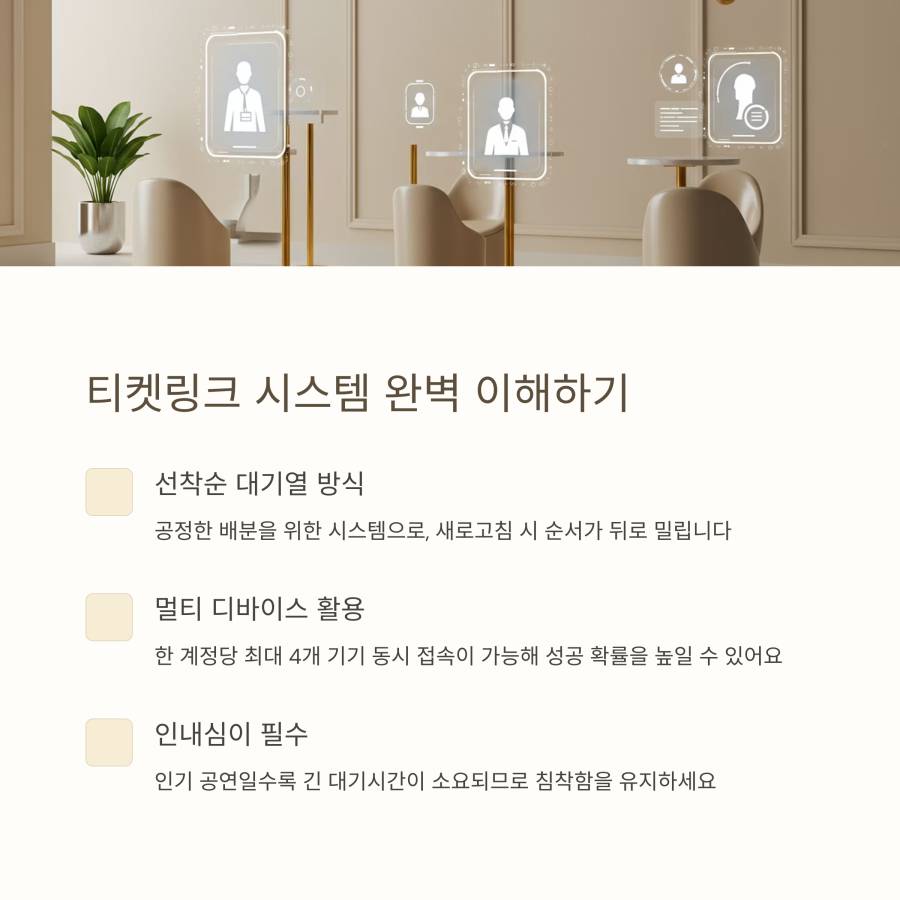 오픈 시간 10~15분 전에 미리 접속해두세요. 티켓링크는 오픈 시간 약 10분 전부터 대기실이 열리는 경우가 많아요. 미리 들어가 있으면 유리할 수 있답니다.