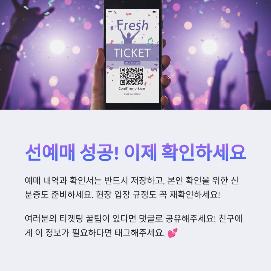 드디어 선예매에 성공했다면 축하드려요! 🎉 하지만 아직 주의해야 할 점이 몇 가지 있어요. 예매 후에는 반드시 예매 내역을 확인하고 이메일이나 문자로 발송된 예매 확인서를 보관해두세요.