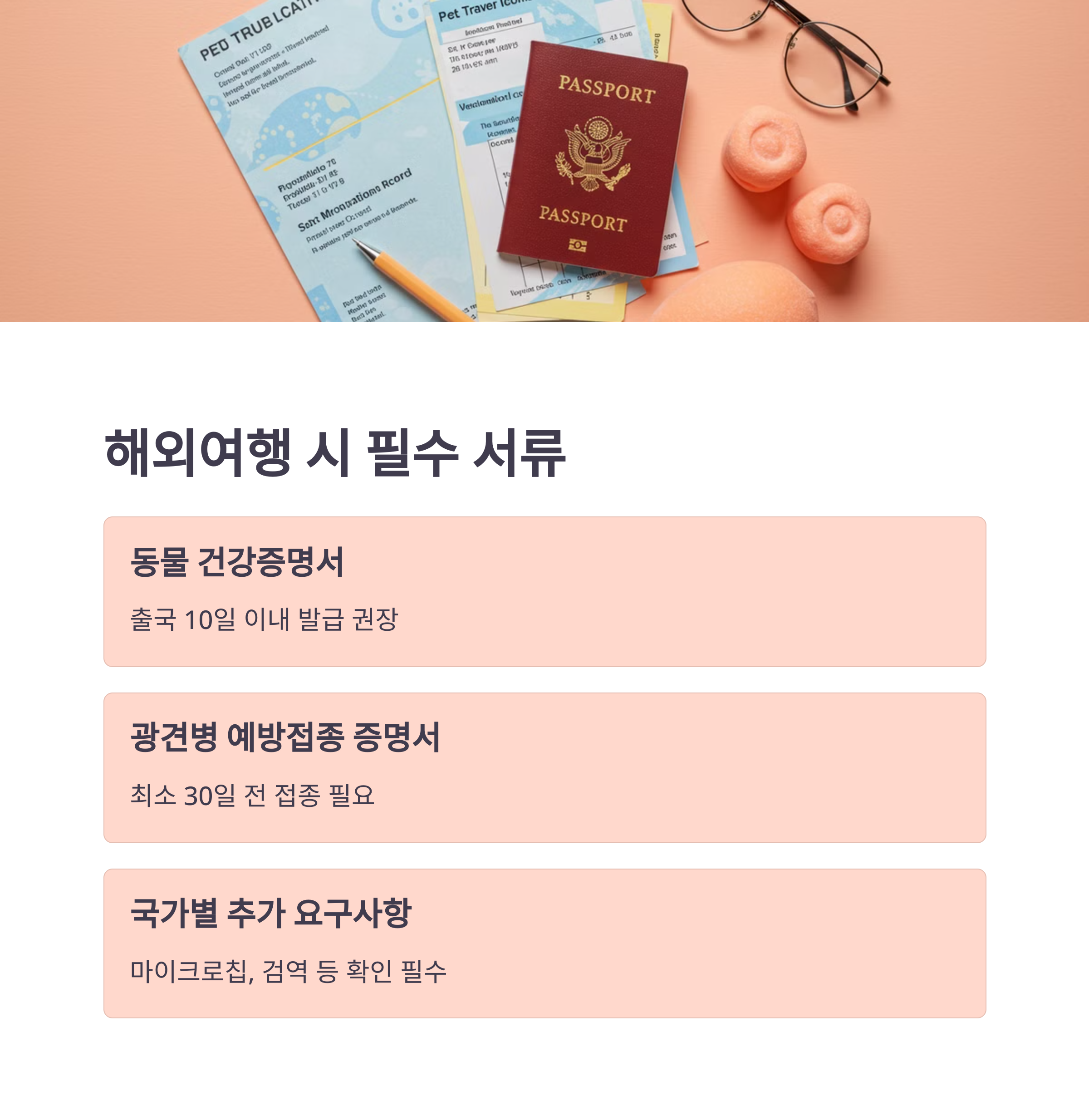 대부분의 국가에서 공통적으로 요구하는 서류는 동물 건강증명서(Health Certificate)와 광견병 예방접종 증명서예요. 특히 EU 국가로 입국할 경우에는 마이크로칩 이식과 EU 반려동물 여권(Pet Passport)이 필요할 수 있어요.