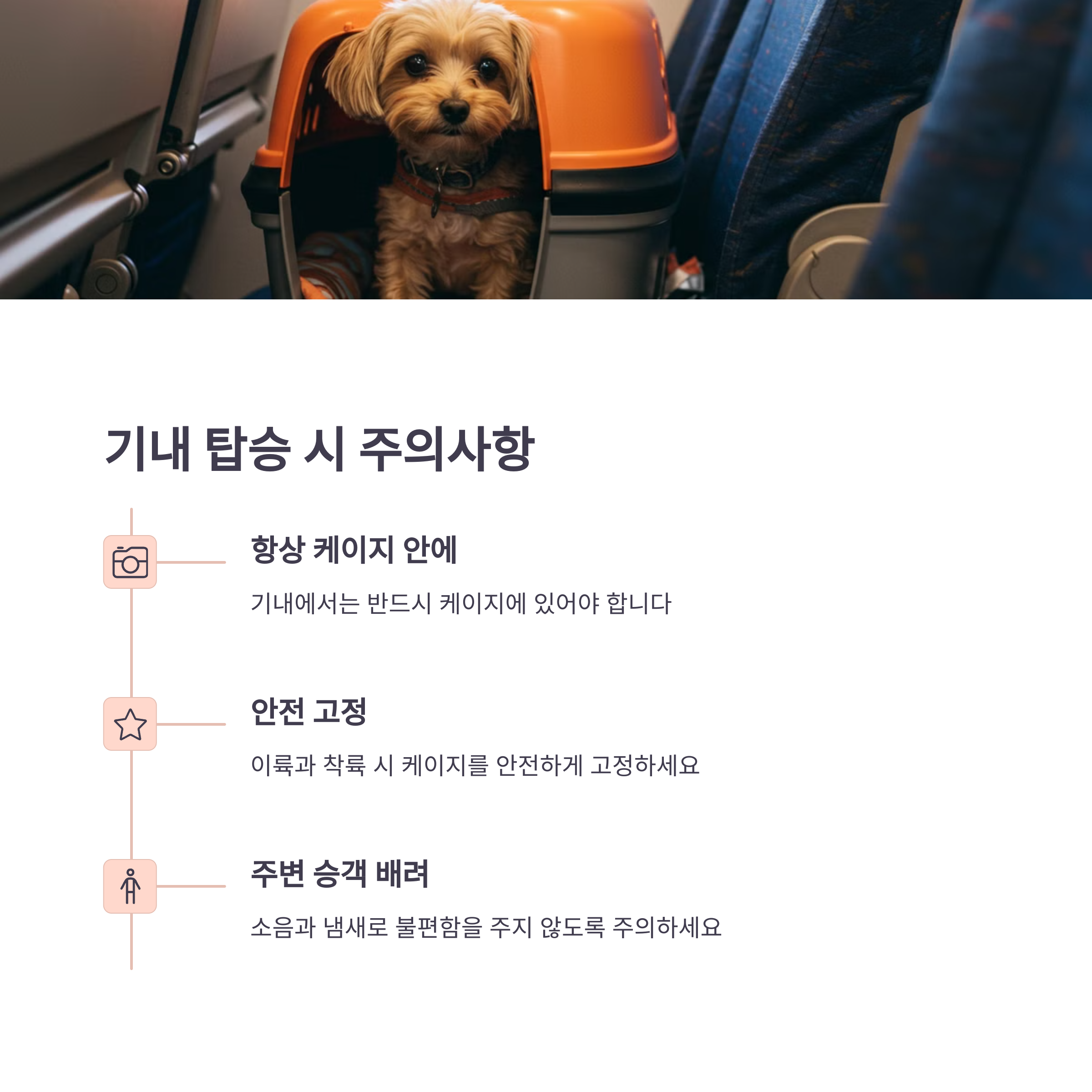 기내에 반려동물을 동반할 수 있다면, 여러분과 가장 가까운 곳에서 안전하게 여행할 수 있어요. 하지만 몇 가지 중요한 가이드라인을 알아둘 필요가 있어요.