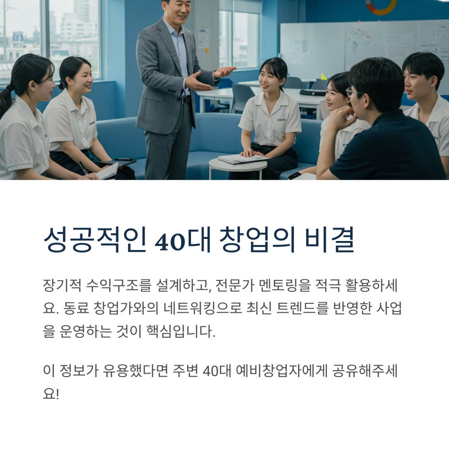 40대 창업은 도전이지만, 풍부한 경험과 인맥을 바탕으로 성공 가능성이 높은 시기이기도 합니다. 다양한 지원 제도를 활용해 든든한 출발을 준비하시길 바랍니다. 여러분의 창업 도전을 응원합니다!