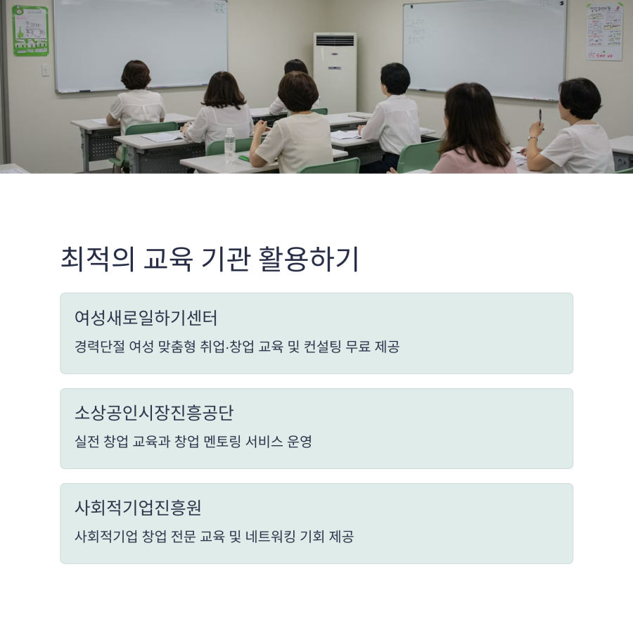 | 지역 노인복지관 | 여성인력개발센터 | 지자체 창업지원센터 |