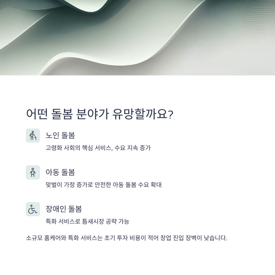 돌봄 서비스는 우리 사회에서 지속적으로 필요로 하는 영역이며, 특히 고령화 사회로 접어들면서 그 수요가 더욱 증가하고 있어요. 여러분의 따뜻한 마음과 경험을 바탕으로 의미 있는 사업을 시작해보는 건 어떨까요?