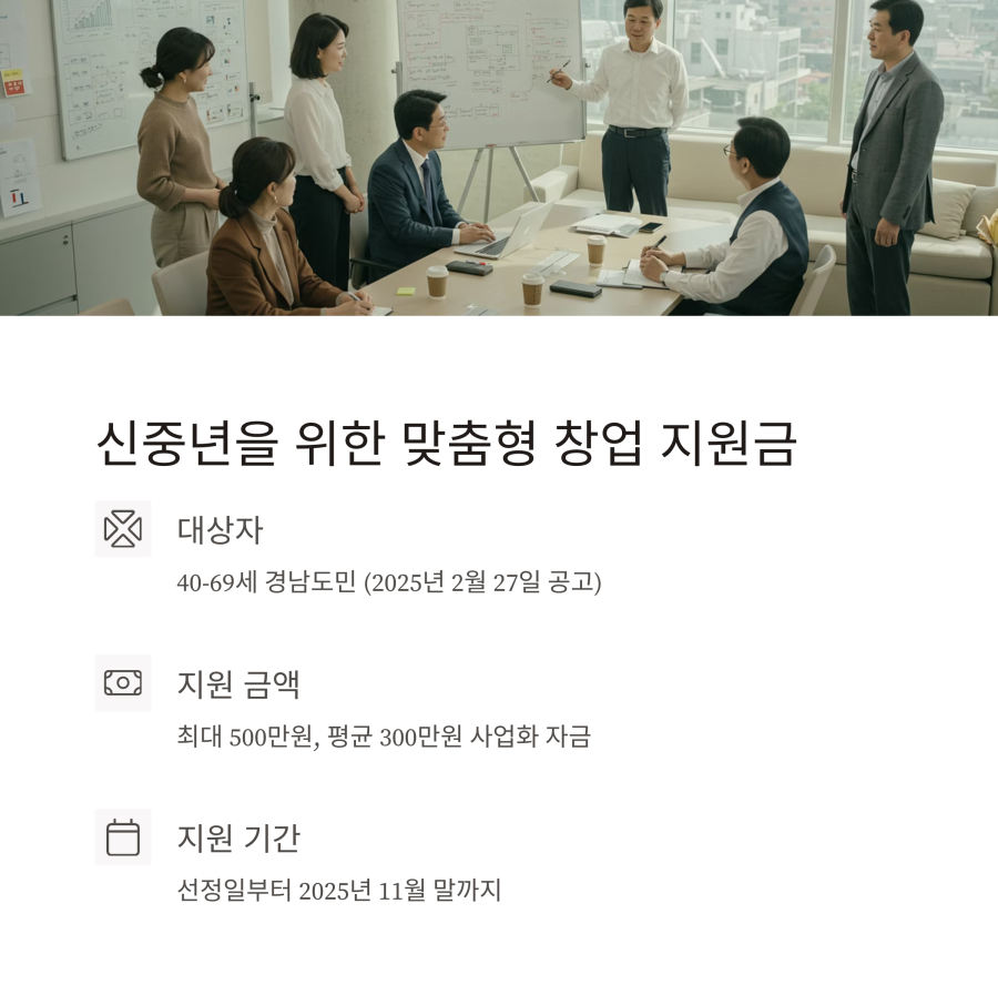 가장 먼저 확인해볼 만한 프로그램은 중소벤처기업부에서 진행하는 신중년 창업 지원사업입니다. 이 프로그램은 만 40세 이상 창업자에게 교육부터 자금까지 종합적인 지원을 제공하고 있어요.