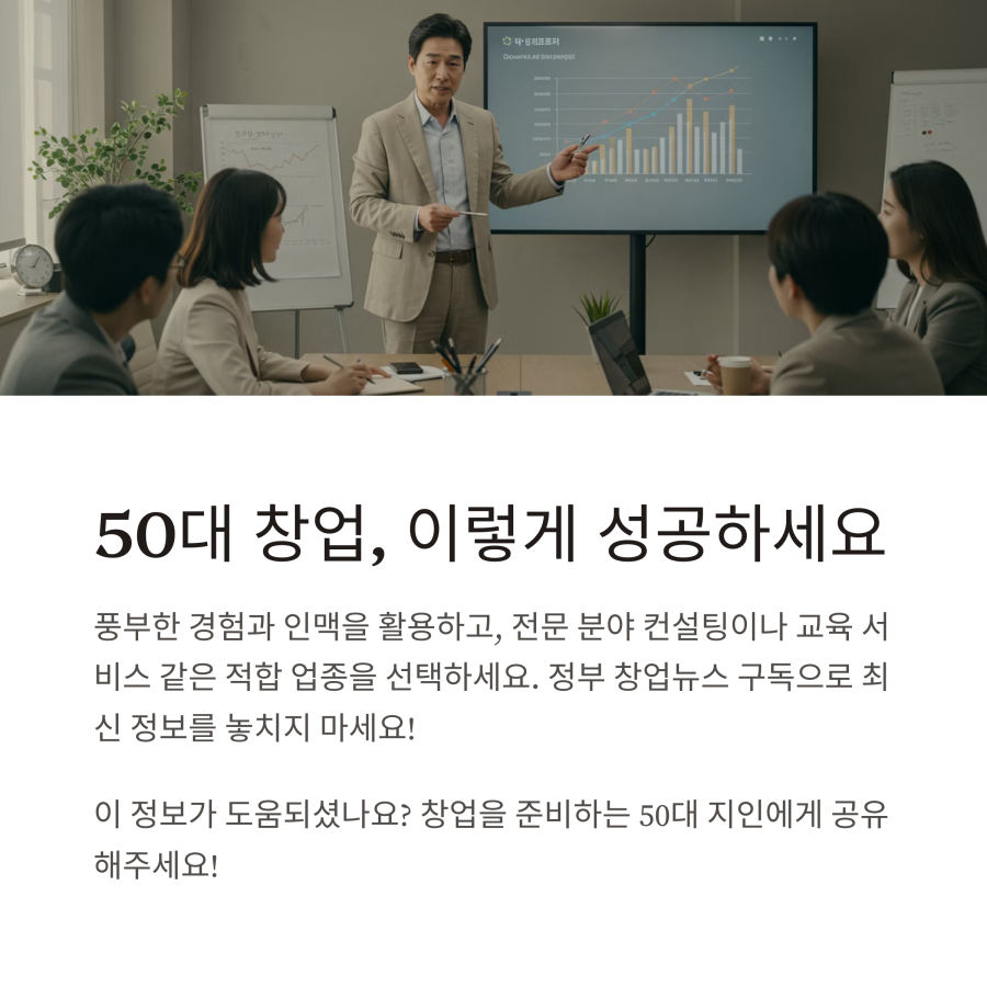 50대 창업에서 가장 중요한 것은 여러분의 경험과 강점을 살릴 수 있는 아이템을 선택하는 것이에요. 무조건 트렌디한 분야보다는 본인의 전문성을 발휘할 수 있는 영역을 찾아보세요.