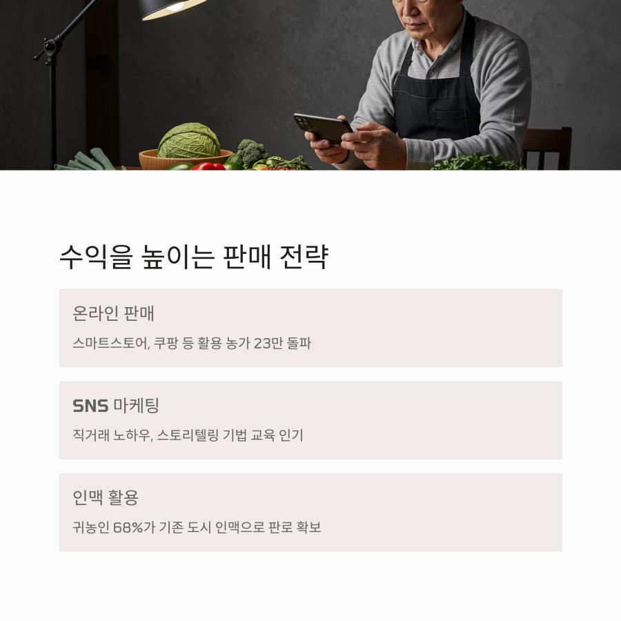 50대 귀농인의 강점은 풍부한 사회 경험입니다. 이전 직장에서의 인맥과 경험을 농산물 판매에 활용해보세요.