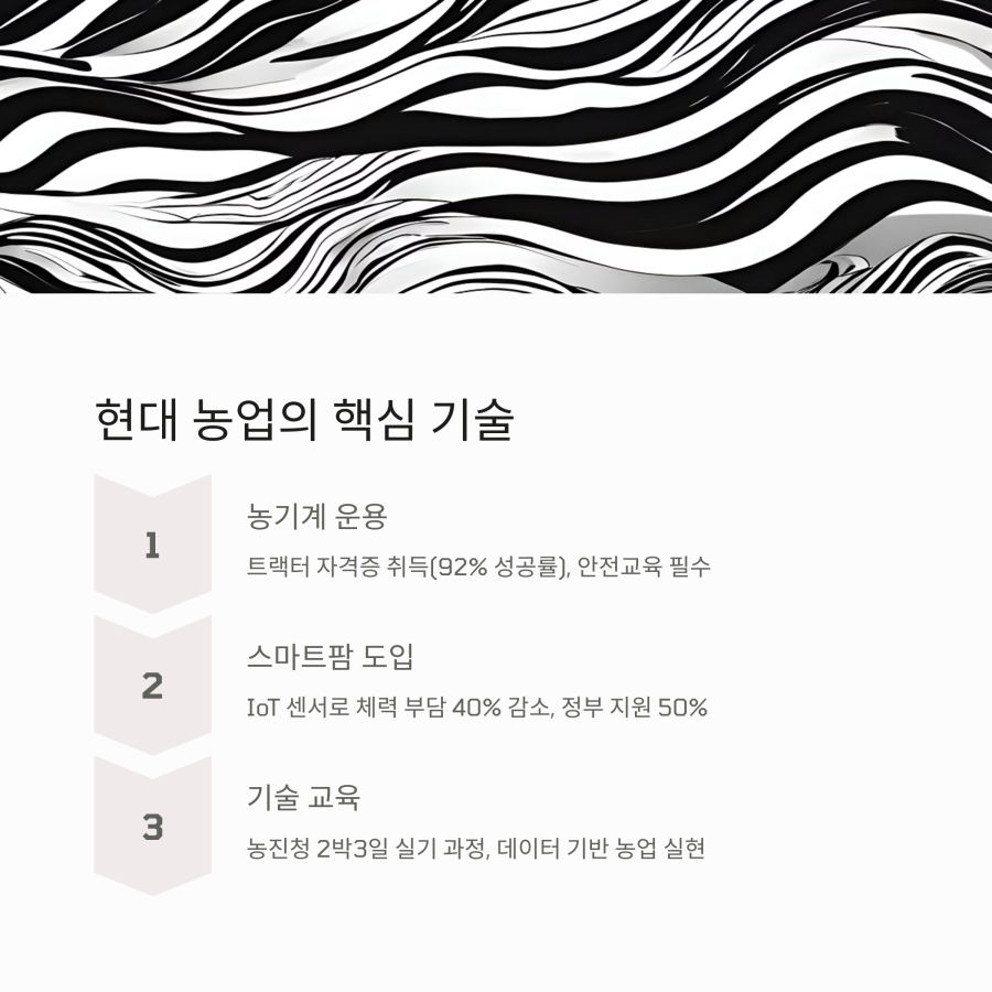 현대 농업에서 농기계는 필수입니다. 트랙터, 경운기, 파종기 등 다양한 농기계의 운용법과 기본적인 정비 기술을 배워두면 큰 도움이 됩니다.