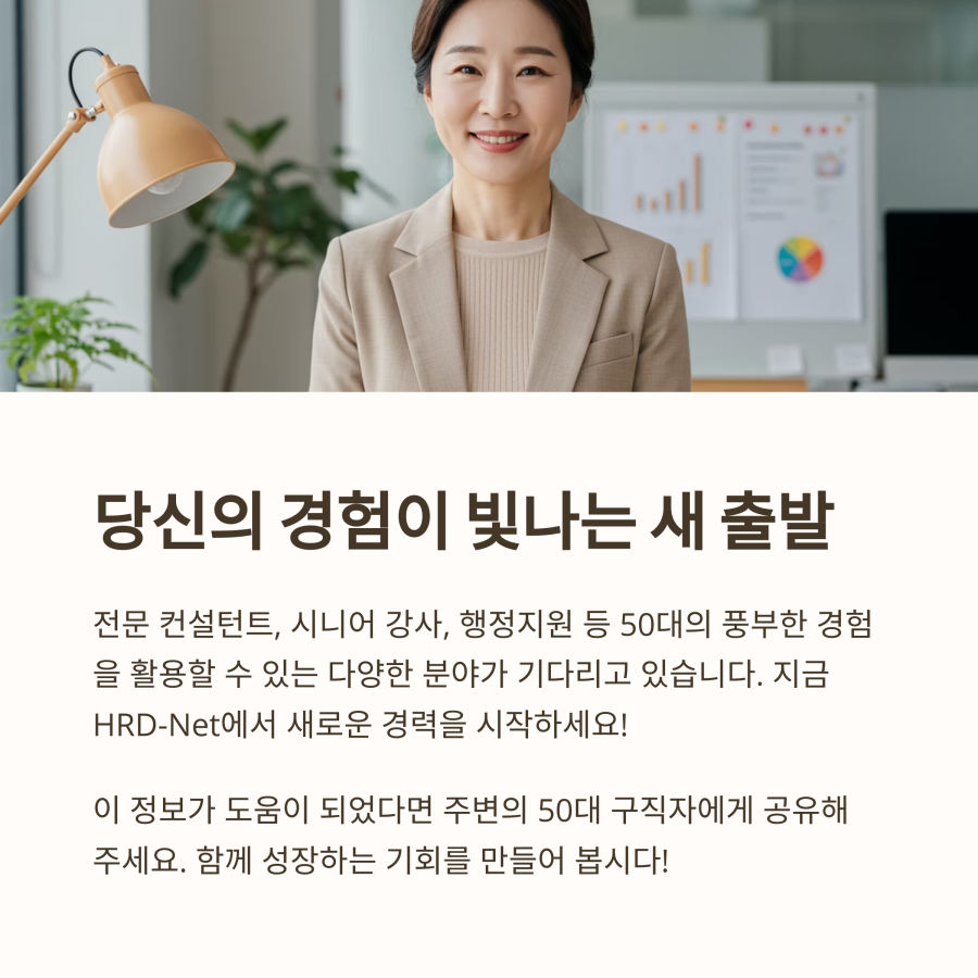 HRD-Net에서는 연령대별 취업 유망 직종 정보도 제공하고 있어요. 50대에게 특히 유망한 직종으로는 전문 컨설턴트, 시니어 강사, 행정 지원 등이 있습니다.