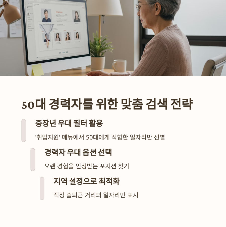 '연령 제한 없음' 또는 '중장년 우대' 필터를 적용하면 50대에게 적합한 일자리만 골라볼 수 있어요. 또한 경력자 우대 옵션을 선택하면 여러분의 풍부한 경험을 활용할 수 있는 포지션을 더 쉽게 찾을 수 있습니다.