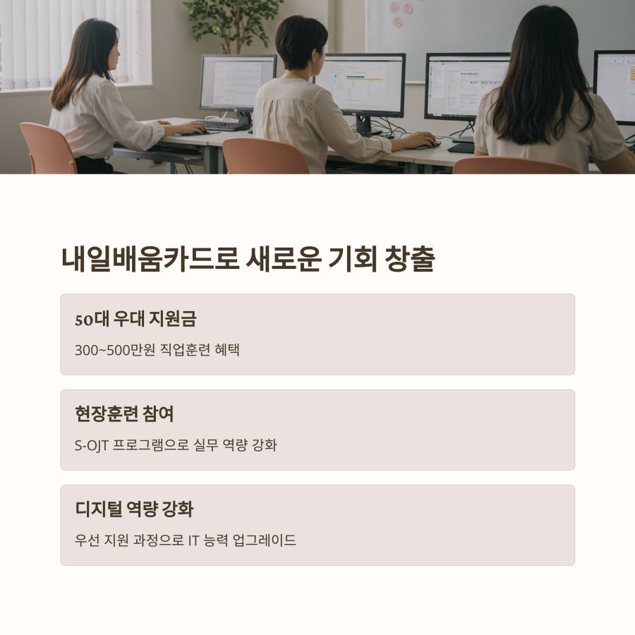 특히 디지털 역량 강화 과정이나 새로운 산업 분야의 훈련과정은 50대의 재취업에 큰 도움이 될 수 있으니 적극 활용해보세요.
