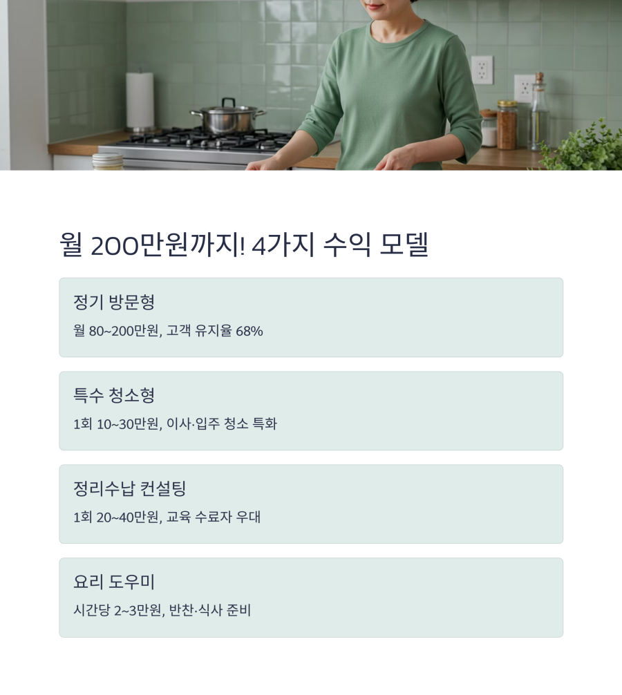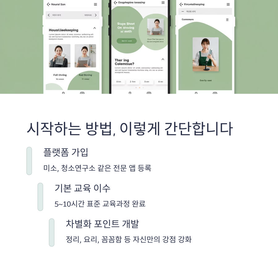 오랜 세월 가정을 꾸려온 경험과 노하우는 가사 도우미 시장에서 큰 경쟁력이 됩니다. 여러분의 경험을 바탕으로 제2의 커리어를 시작해보는 건 어떨까요?