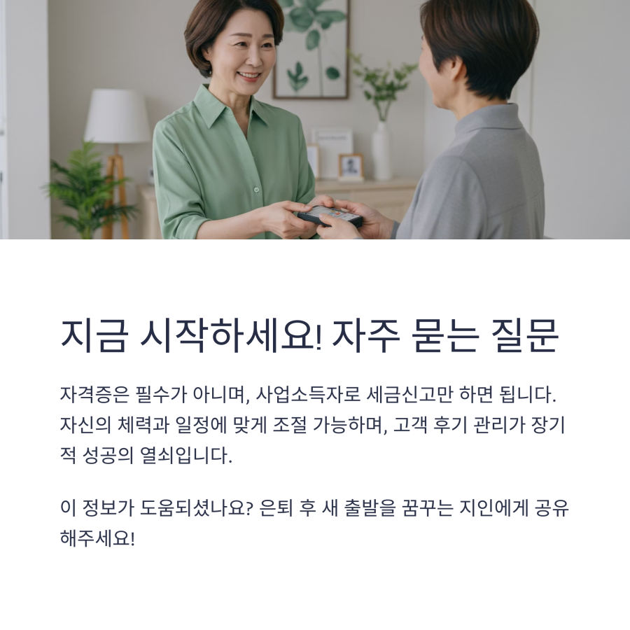 다섯째, 경제적 안정을 얻을 수 있습니다. 정기적인 고객을 확보하면 매달 안정적인 수입을 기대할 수 있어요. 은퇴 후 걱정되는 경제적 불안을 해소하는 데 도움이 됩니다.