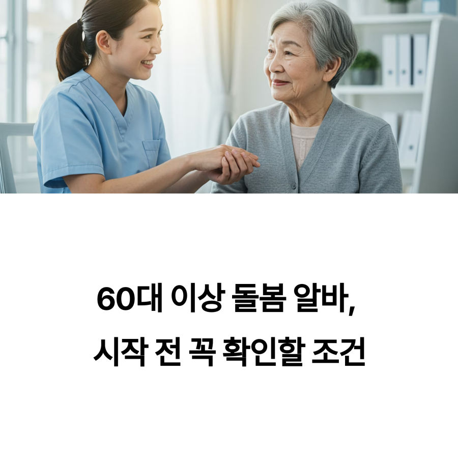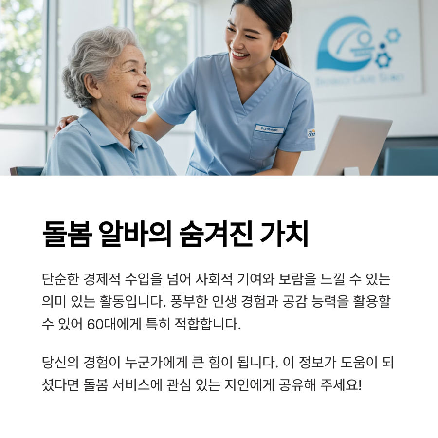 오랜 경험과 지혜를 가진 60대 이상 분들은 돌봄 서비스에 특별한 가치를 더할 수 있습니다. 하지만 본인의 건강과 상황에 맞는 일자리를 찾는 것이 무엇보다 중요합니다.