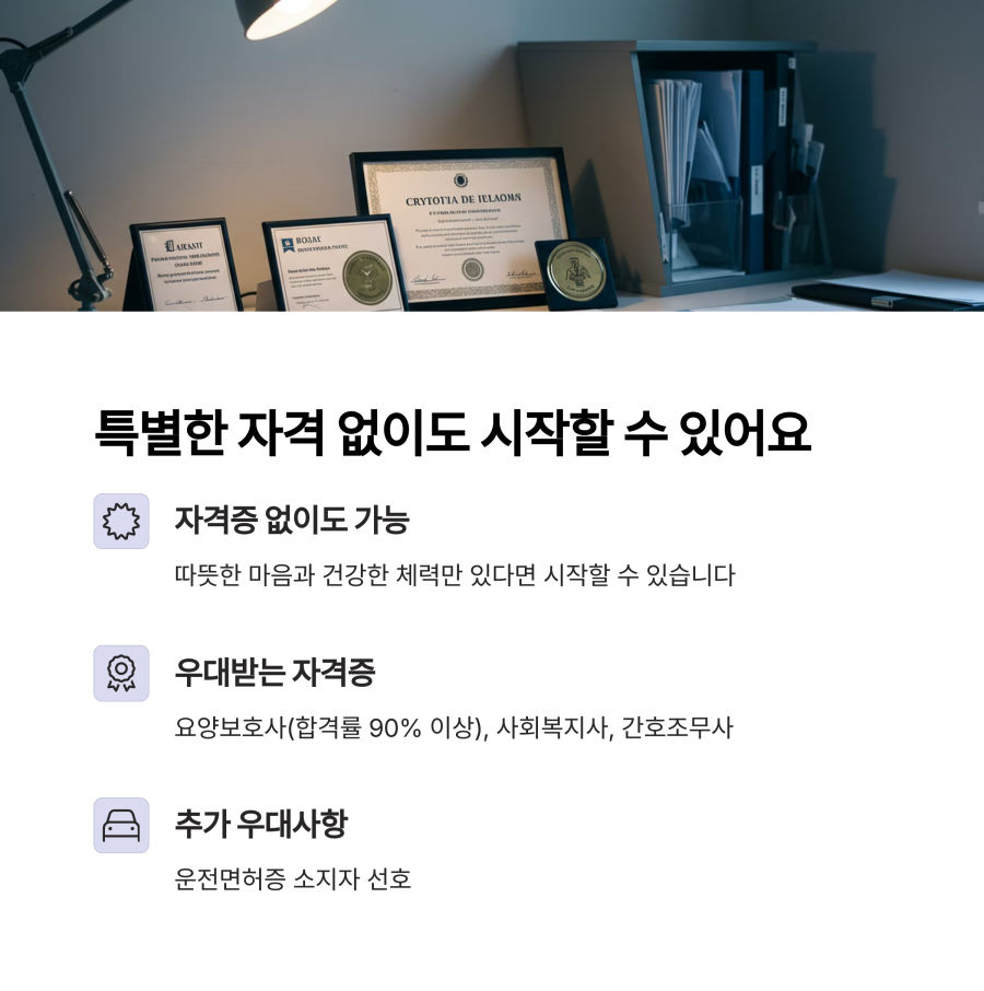 A: 네, 가능합니다. 요양보호사 자격증이 있으면 더 좋지만, 없어도 지원 가능한 돌봄 알바가 많이 있습니다. 특히 말벗이나 가벼운 가사 도움 위주의 돌봄 서비스는 자격증 없이도 가능한 경우가 많아요.